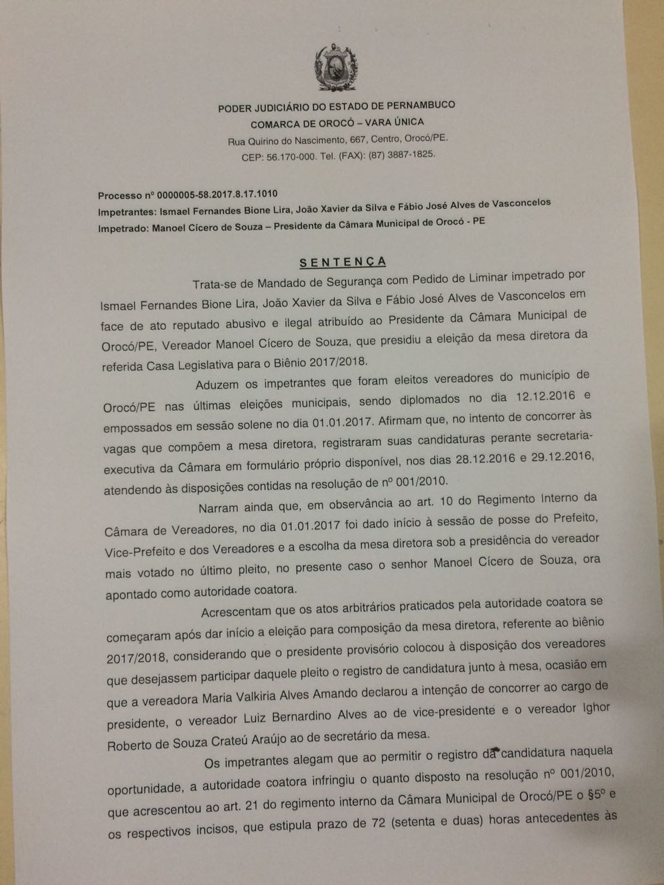 Em Orocó (PE), Sertão do São Fancisco, a justiça acatou um mandado de segurança impetrado pelos vereadores Ismael Lira, João de Demar e Binho de Seu Tonho determinando a anulação da eleição da Mesa Diretora, ocorrida no final de dezembro passado.